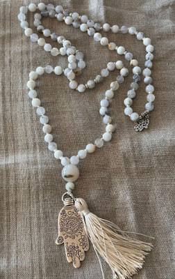 Au moment de la réalisation de ton Mala, tu assembleras tes perles une à une par un nœud, en y mettant une affirmation de ton choix.